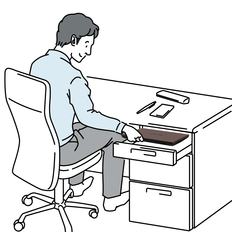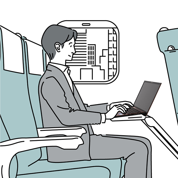毎日持ち歩いても苦にならない約1.072kg*の軽量ボディ。 さらに、スリムタイプのビジネスバッグはもちろん、サイドデスクにもサッとしまっておけるA4ファイル程度の大きさ。新幹線の狭いテーブルでも快適に作業できます。 * 最軽量構成時。構成によって質量は異なります。