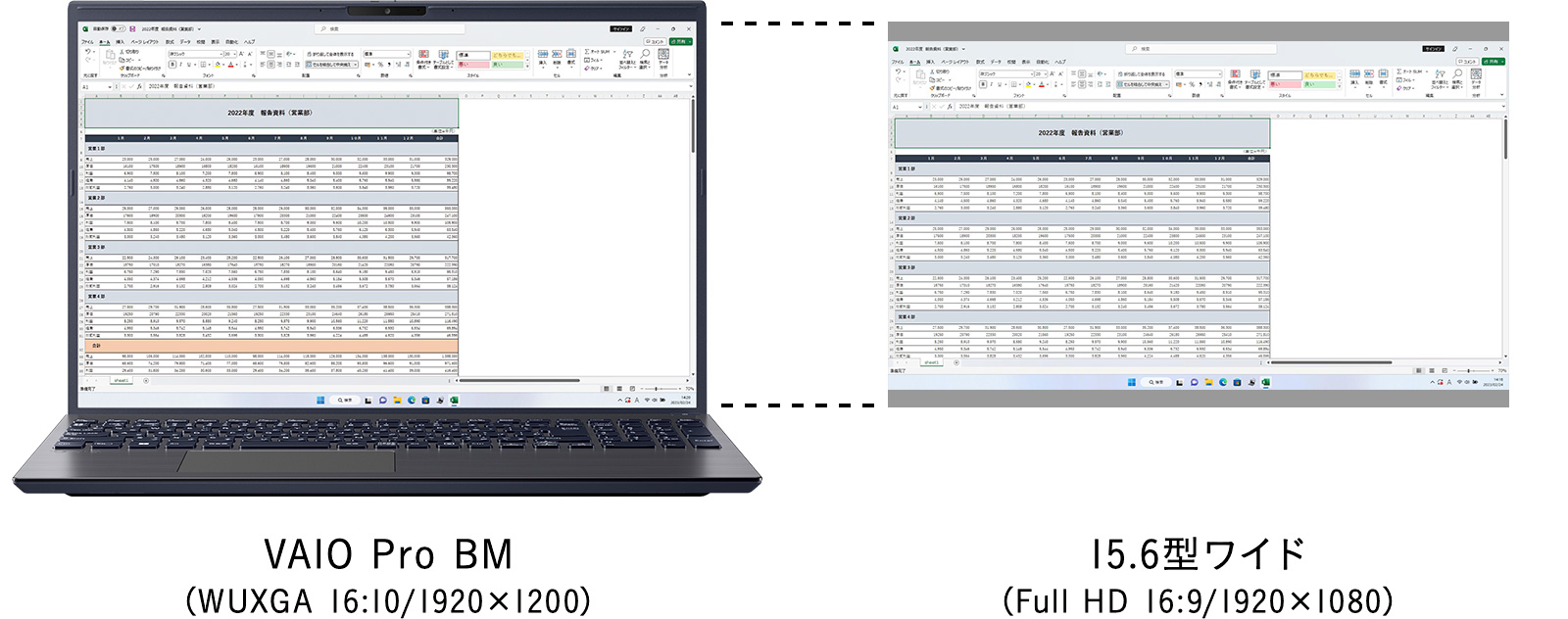 一般的なA4ノートPCの画面サイズは15.6型ワイドですが、それと同等のボディに、ひとまわり大きな16.0型ワイド液晶を搭載。15.6型ワイドより約11.4%画面が広く、高さに余裕があるため、複雑なスプレッドシートの閲覧や編集もより効率的に行えます。さらに、PCを持ち運んで使う機会が増えているため、モビリティも重要です。デスクトップ級の操作性を保ちながら、スリムで好きな場所へ気軽に持ち運んでお使いいただけるため、生産性が高まります。